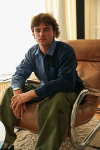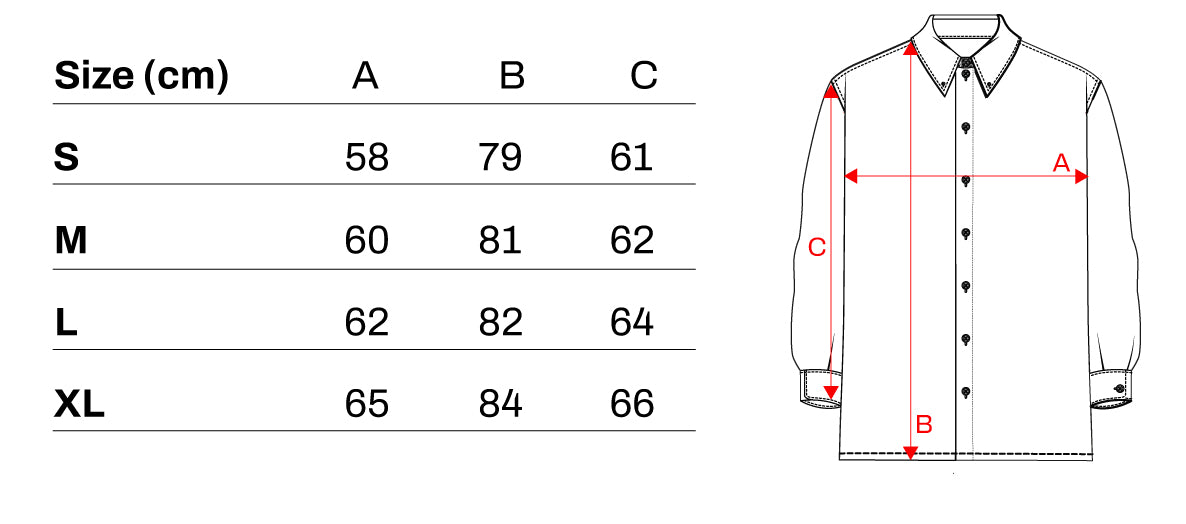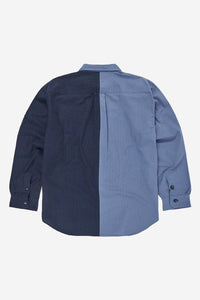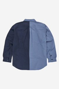 Oversized cut shirt with white buttonholes and hidden label below the last button. The shirt is made of two-tone seersucker fabric. The fabric is Portuguese in origin, and the shirt was sewn in Galicia, Spain.